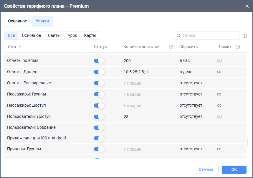 Услуги в этой группе активируют основной функционал Wialon, такой как Качество вождения, Система управления (CMS Manager), Объекты и другие. Здесь вы можете включить или отключить услугу, настроить параметр Количество и стоимость и выбрать период сброса.