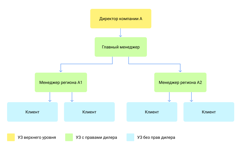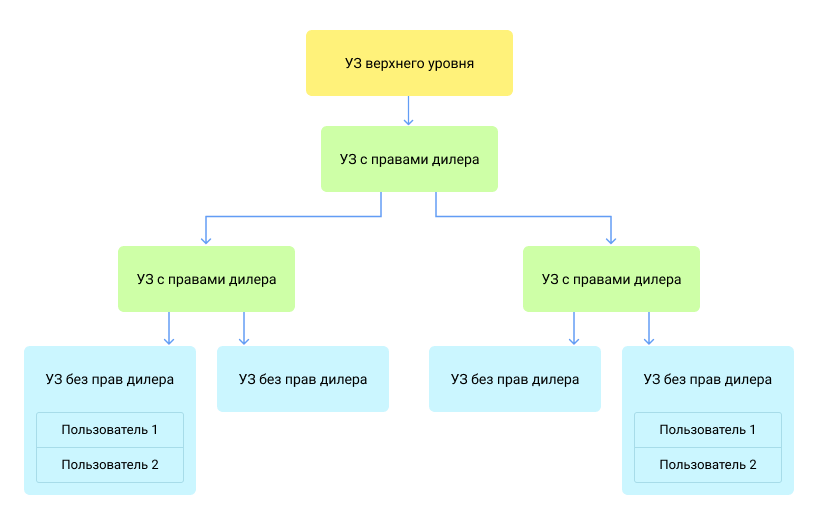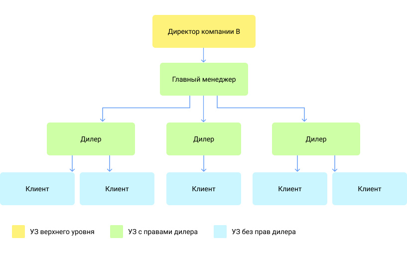 Наименьшее рекомендуемое количество уровней в иерархии — три (УЗ верхнего уровня, УЗ с правами дилера, УЗ без прав дилера). В зависимости от особенностей вашего бизнеса, может понадобиться более глубокая и разветвленная структура сервиса.