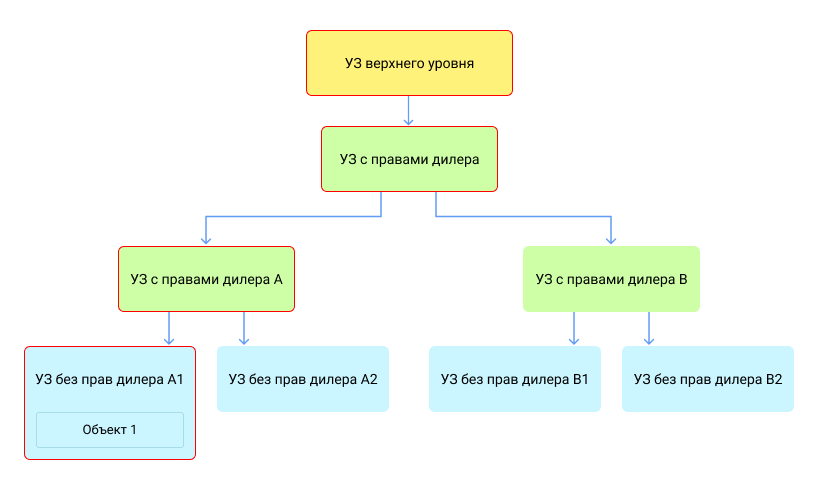 - При создании элементов в дочерних учетных записях права на них автоматически предоставляются пользователям-создателям вверх по иерархии. Например, на схеме ниже объект был создан в УЗ без прав дилера А1. Права на этот объект получили все пользователи-создатели, учетные записи которых обведены красным цветом.