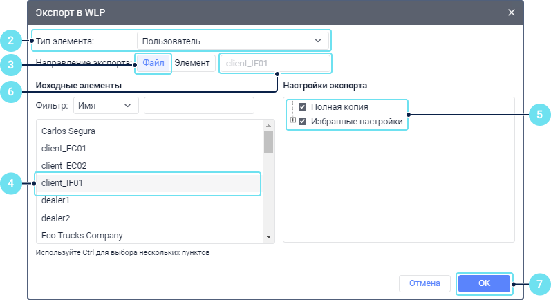 В результате данные сохраняются в одном файле WLP (если был выбран один исходный элемент) или нескольких (если было выбрано несколько элементов).