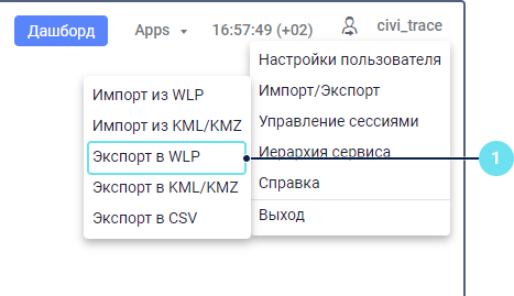 В меню пользователя выберите пункт Импорт/Экспорт и затем — Экспорт в WLP.