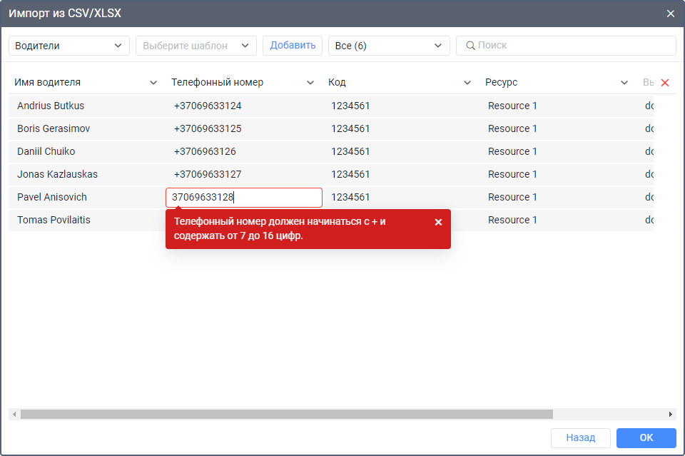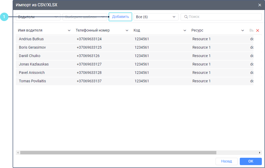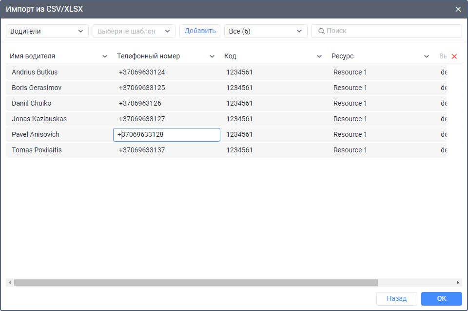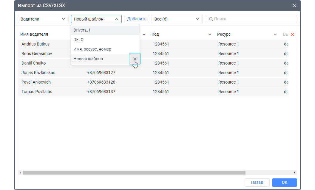 Ресурс* | Ресурс, в который вы хотите импортировать водителя. | Имя ресурса должно совпадать с именем существующего в системе ресурса. Также для учетной записи, которой принадлежит этот ресурс, должна быть активирована услуга Водители. |