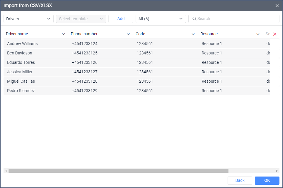 Укажите названия столбцов. Для этого вы можете применить сохраненный ранее шаблон или выбрать названия в выпадающих списках над столбцами. Названия, которые обязательно нужно выбрать, отмечены звездочкой (*). Описание всех доступных столбцов смотрите в разделах Таблица импорта объектов, Таблица импорта водителей, Таблица импорта заправок.