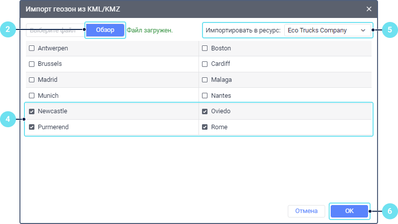 Эта функция позволяет копировать геозоны из файла форматов KML и KMZ в ресурс.