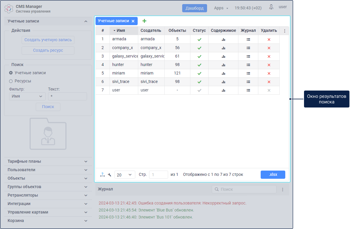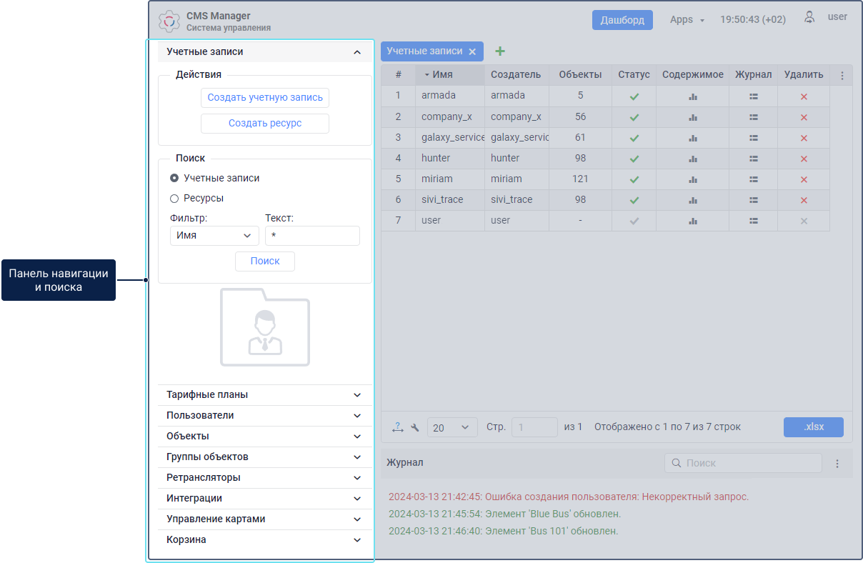 В интерфейсе системы управления можно выделить следующие основные элементы: