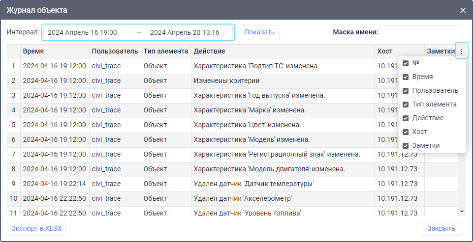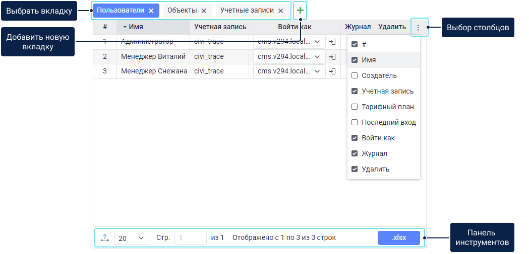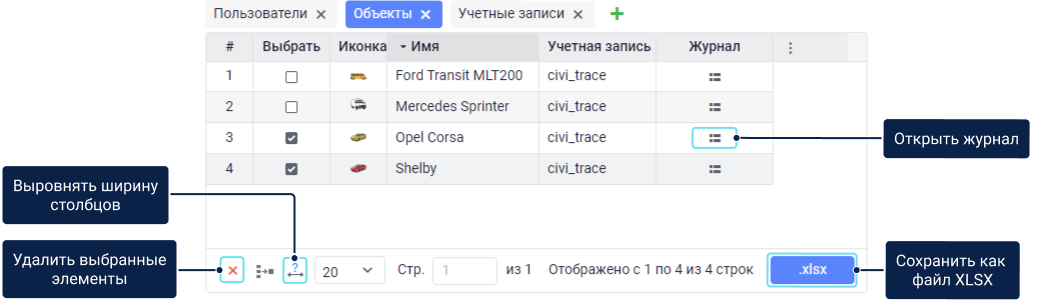 Сохранить данные из таблицы как файл XLSX. Доступно для разделов Учетные записи, Ресурсы, Пользователи, Объекты, Группы объектов и Ретрансляторы. |