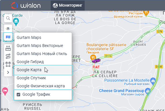 Если вы выбрали Google как источник карт, включите нужную картооснову в меню на карте. Также можно включить дополнительные слои, если они есть, например, Google Трафик.