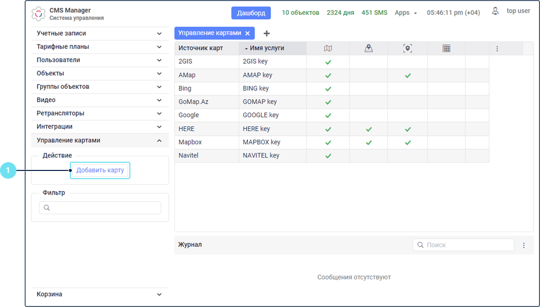 В CMS Manager в разделе Управление картами нажмите на кнопку Добавить карту. Если вы купили ключ у компании Gurtam, то добавлять карту не требуется. Найдите ее в списке и щелкните по ней, чтобы открыть ее свойства.