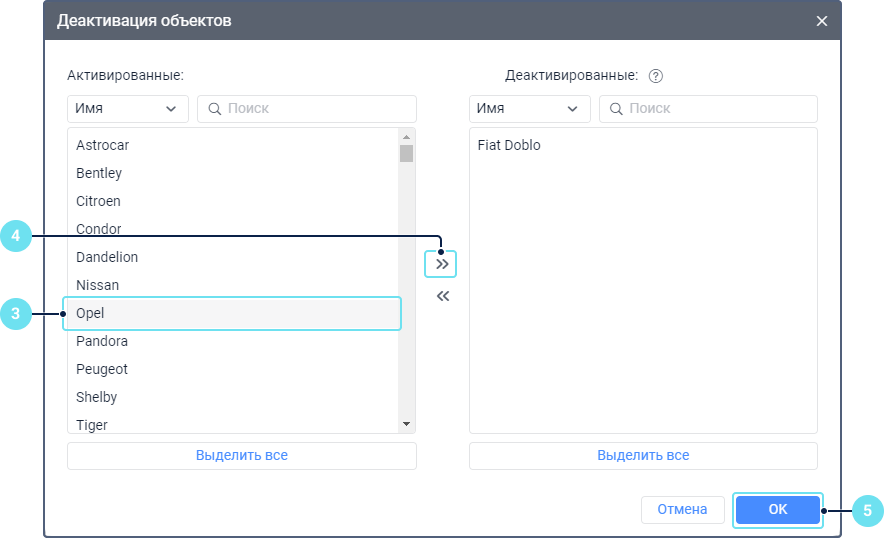 В левом списке выберите объект, который вы хотите деактивировать. Для поиска воспользуйтесь динамическим фильтром.
