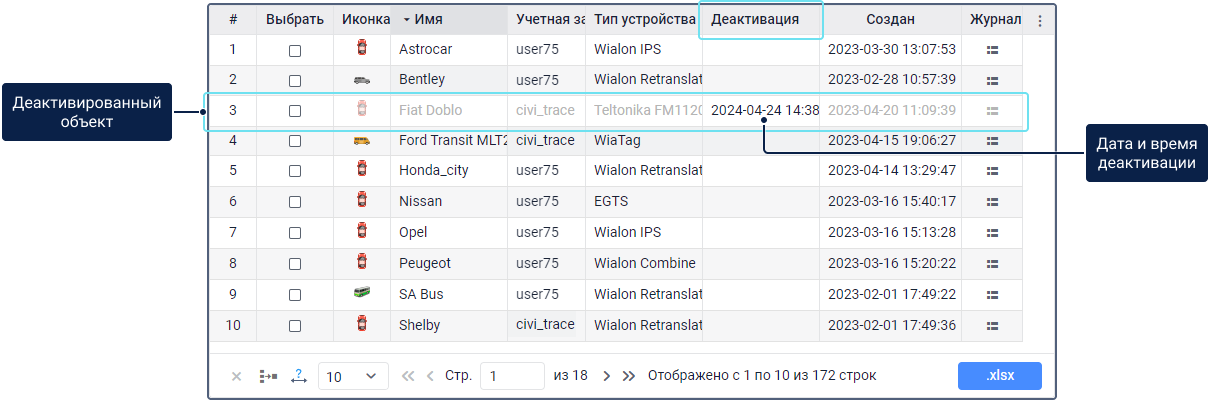 Строки с деактивированными объектами выделены светло-серым цветом в таблице. Дата и время деактивации показываются в столбце Деактивация.