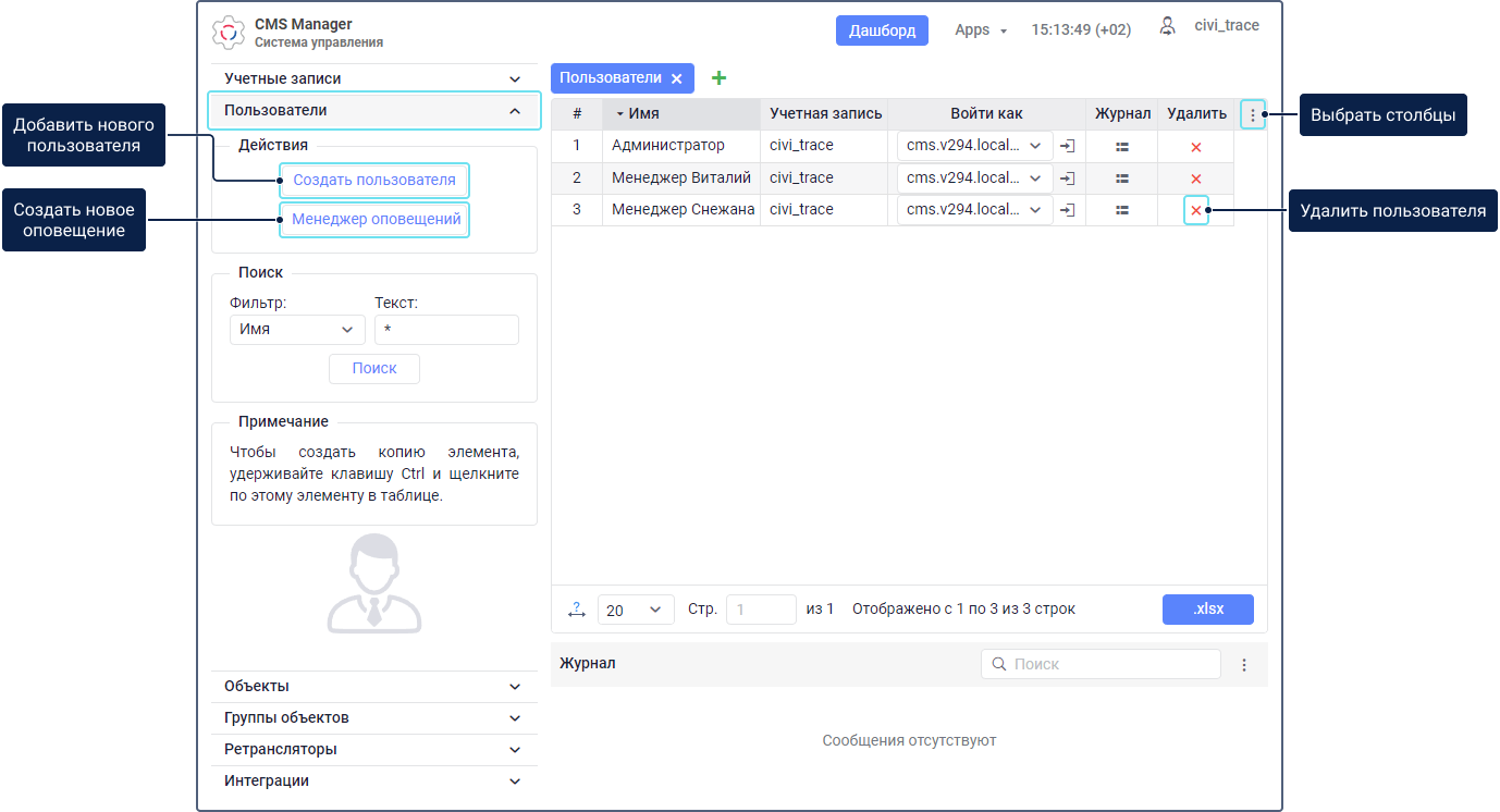 С пользователями можно работать в системе мониторинга (вкладка Пользователи) и в системе управления (раздел Пользователи).