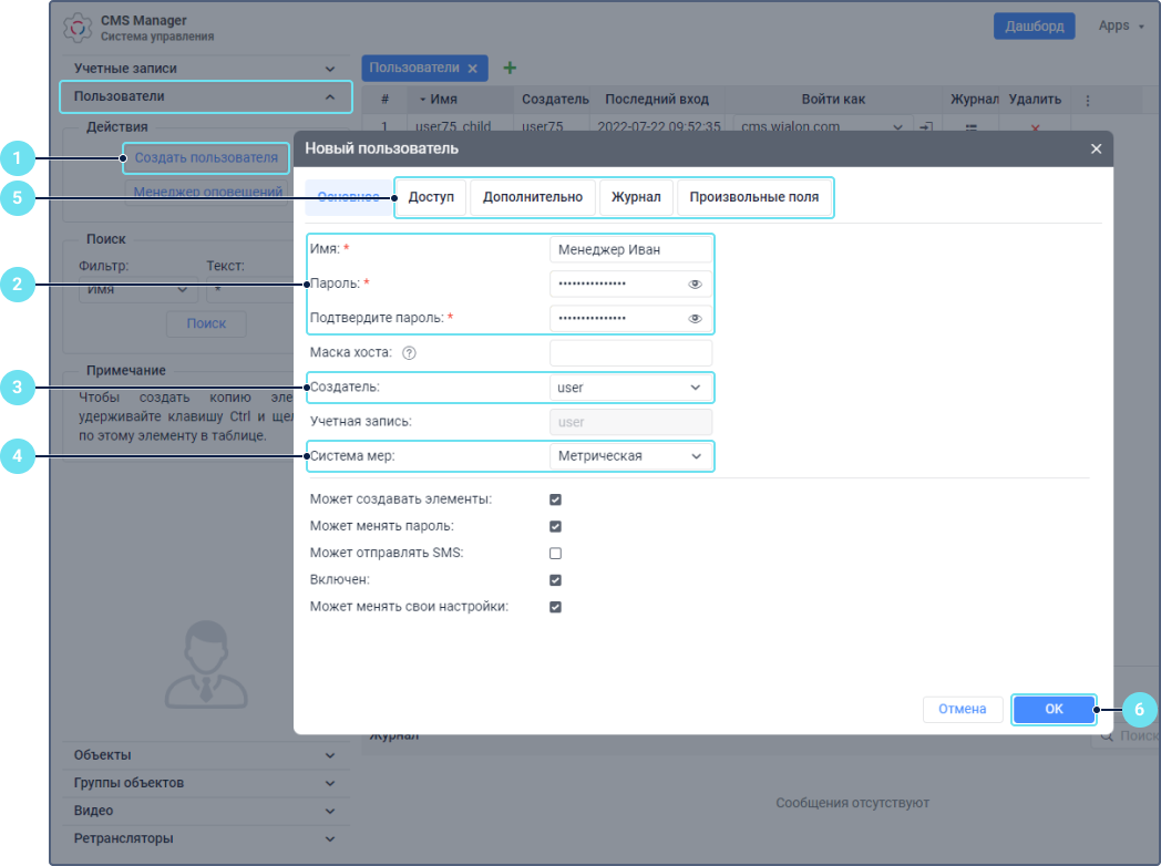 - вручную с помощью кнопки Создать пользователя (раздел Пользователи в системе управления) или кнопки Создать (вкладка Пользователи в системе мониторинга).