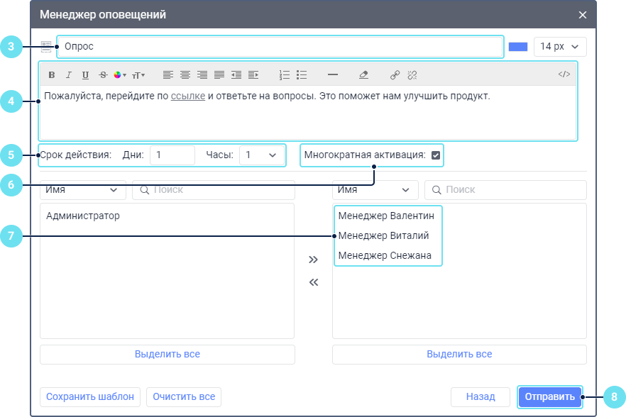 В диалоговом окне Менеджер оповещений вы можете создавать информационные сообщения (оповещения) и отправлять их пользователям.