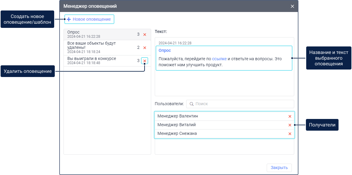 При наличии отправленных оповещений в левой части окна показывается их список. В каждой строке указано название оповещения, дата и время его отправки и число получателей.