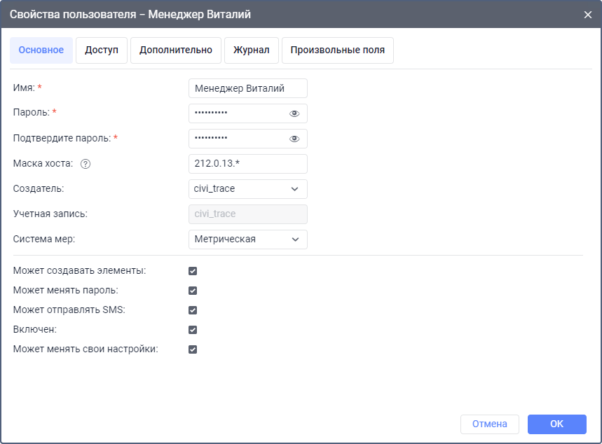 Окно свойств пользователя показывается при создании, редактировании и копировании пользователя. В этом окне вы можете указать различные параметры пользователя, настроить доступ к нему, посмотреть журнал действий, добавить произвольные поля и пр.