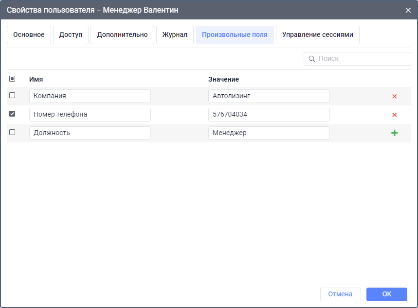 На этой вкладке можно создать произвольные поля с дополнительной информацией о пользователе.
