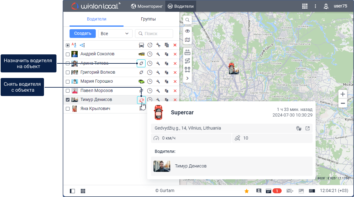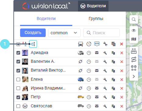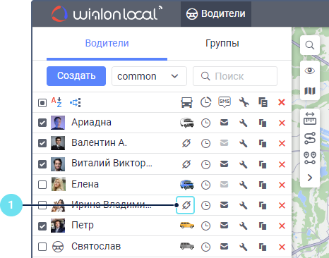 Назначить и снять водителя с объекта вручную можно в режиме Водители или Группы на вкладке Водители с помощью иконок