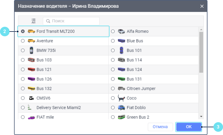 Чтобы назначить водителя на объект вручную, сделайте следующее: