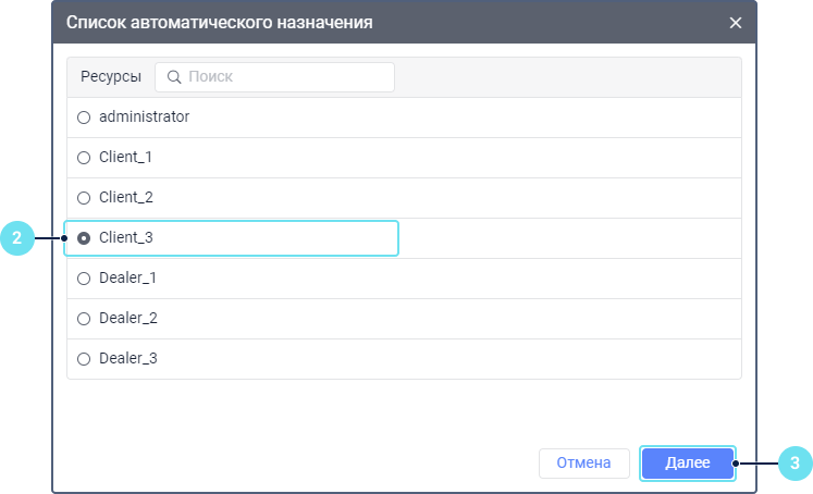 Выберите ресурс, водители которого должны использоваться для автоматического назначения. Чтобы узнать, какие водители принадлежат определенному ресурс, примените фильтр по ресурсу к списку водителей (расположен справа от кнопки Создать). Если вам доступен только один ресурс, он выбирается автоматически.