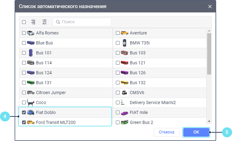 Отметьте объекты или группы объектов, на которые водители выбранного ресурса должны назначаться автоматически. Для переключения между списками объектов и их групп используйте иконку