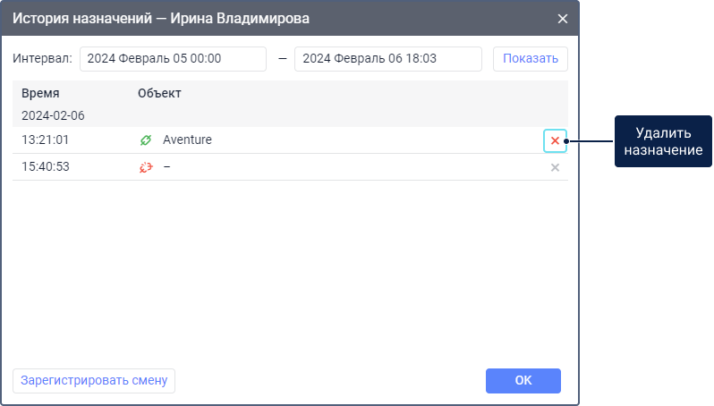 Функция История назначений позволяет увидеть историю назначений водителя, вручную добавить записи о назначениях (зарегистрировать рабочую смену) и удалить их при необходимости. Чтобы выполнить эти действия, нажмите на иконку