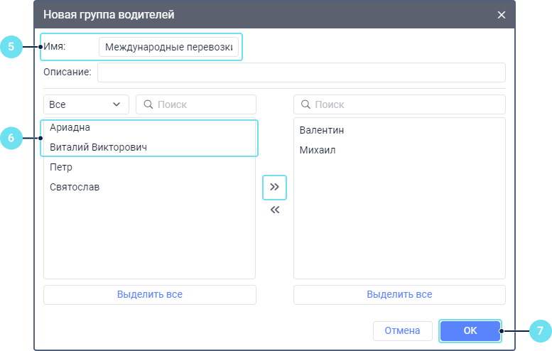 - Выберите водителей, которые должны входить в группу. Для этого в списке слева выделите необходимые и перенесите их в список справа с помощью иконки