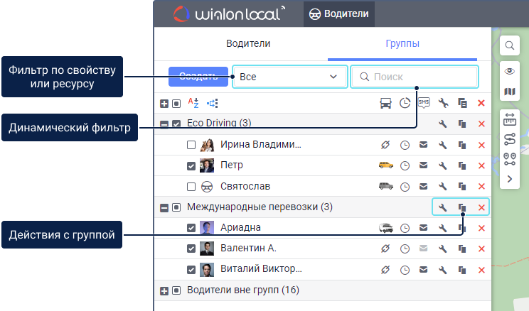 . Для быстрого поиска необходимой группы воспользуйтесь динамическим фильтром или фильтром по свойству (неназначенные или назначенные водители) или ресурсу.