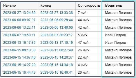 В таблицы большинства отчетов (Поездки, Моточасы, Заправки и зарядки батареи, Сливы, Превышения скорости и др.) можно добавить колонку с именем водителя. Оно показывается, если водитель был назначен на объект в выбранный интервал отчета.