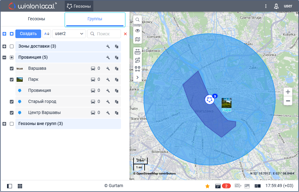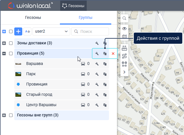 Разверните строку группы, чтобы увидеть входящие в нее геозоны и выполнить действия с ними. Чтобы на карте показывались все геозоны из группы, отметьте ее в списке.