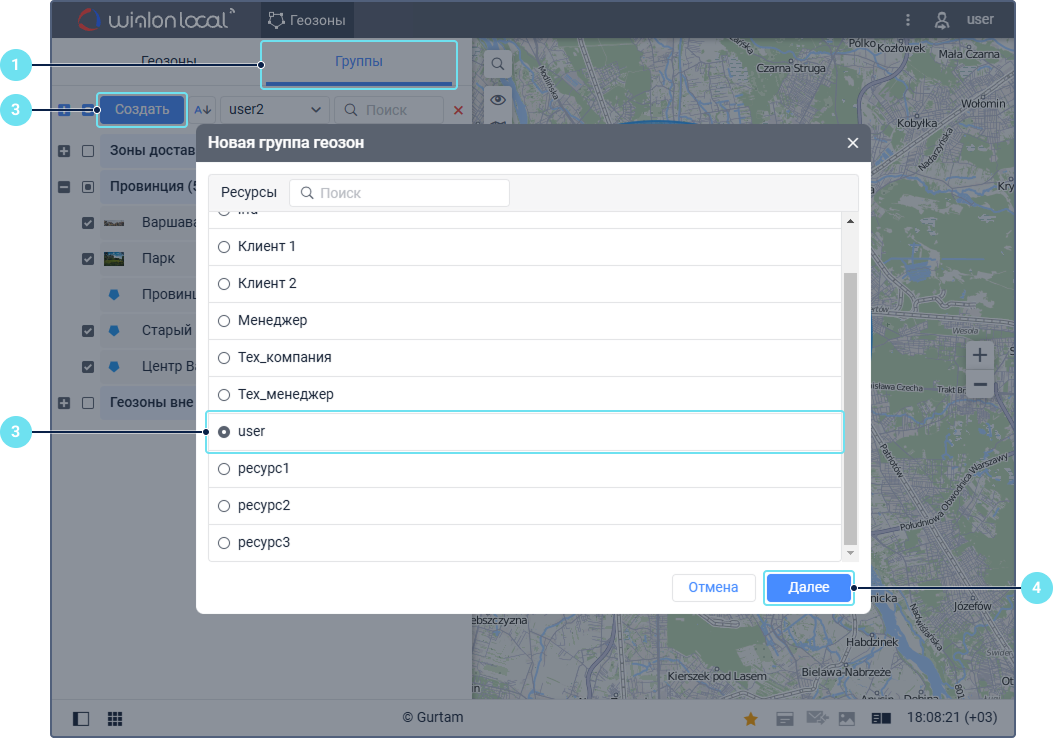 - Выберите ресурс, в котором необходимо создать группу геозон.