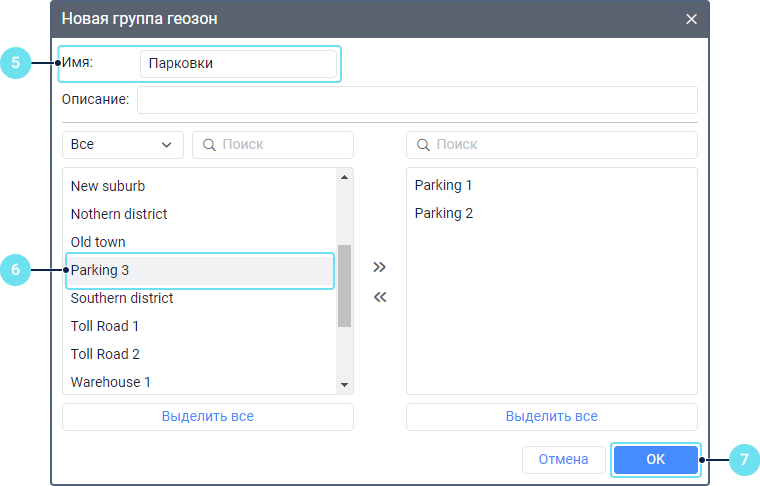 . Чтобы выбрать все геозоны одновременно, нажмите на кнопку Выделить все. Для выбора сразу всех или нескольких геозон можно также использовать специальные комбинации клавиш. Чтобы добавить одну геозону в группу, дважды щелкните по ее имени.
