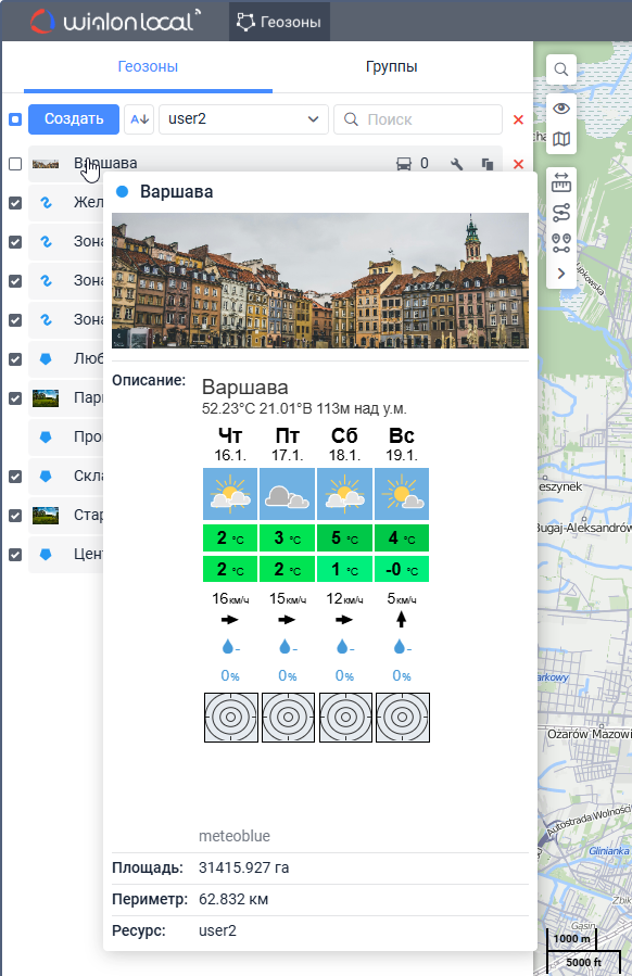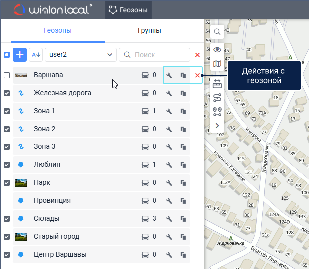 - выполнении действий из списка геозон: редактирование, копирование, удаление;