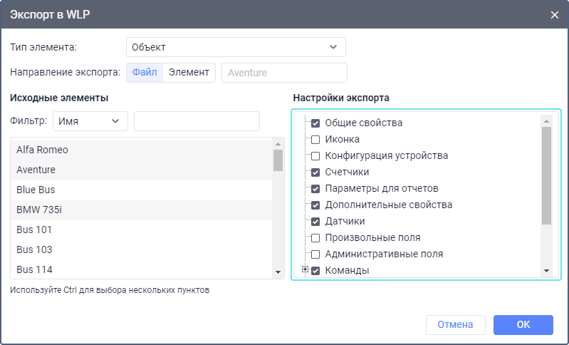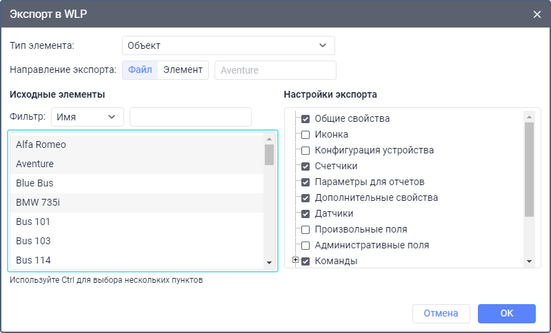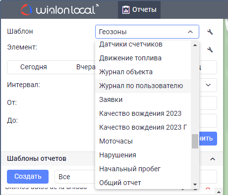 - в отчетах для конкретизации водителя, датчика, события (нарушения), маршрута и его геозоны, а также при выборе геозон;