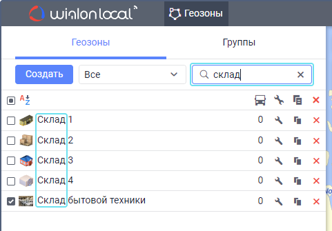 Если в списке находится очень большое количество элементов, для удобства можно воспользоваться быстрым динамическим поиском необходимого элемента. Он применяется для большинства вкладок и окон. Начните набирать имя элемента (геозоны, объекта, маршрута и т. п. — в зависимости от открытой вкладки). Имя можно набирать, начиная с любого места. Регистр не учитывается. По мере введения текста в списке будут показываться элементы, которые соответствуют запросу.