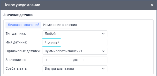Например, есть два топливных датчика, которые называются Датчик уровня топлива и Уровень топлива в баке. Необходимо создать такое уведомление, которое бы учитывало показания обоих этих датчиков. Для этого нужно при конфигурации уведомления задать такую маску имени, чтобы она соответствовала обоим датчикам. В данном случае оптимальный вариант — *топлив*: