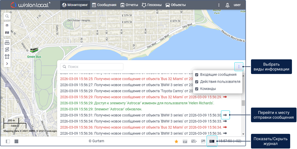 В журнале в реальном времени показывается информация о получении сообщений от объектов, отправке и выполнении команд и действиях пользователя.