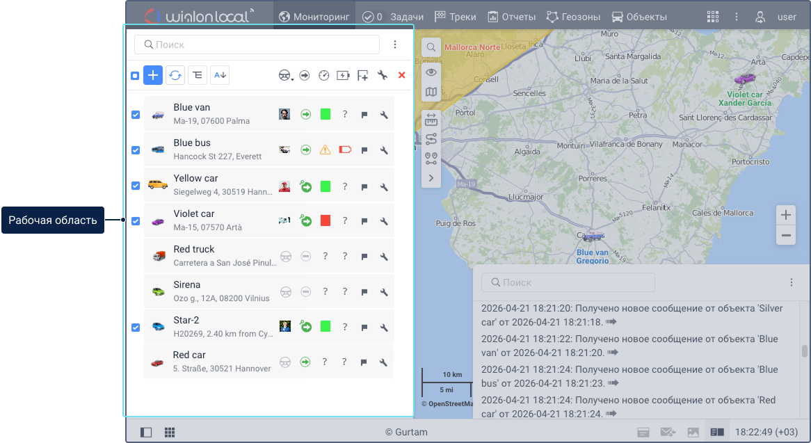 В рабочей области можно выполнять различные действия с элементами системы. Ее содержимое зависит от вкладки, выбранной в главном меню.