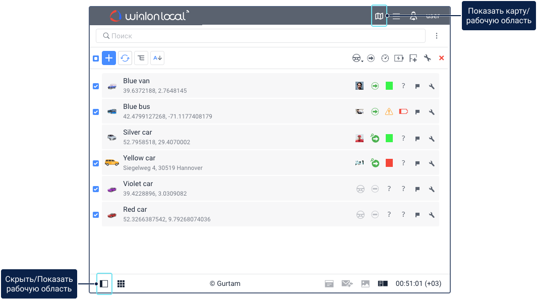 Если ширина экрана не позволяет показывать рабочую область и карту одновременно, то для переключения между ними можно также использовать иконку в верхней панели. Вид иконки зависит от открытой вкладки.