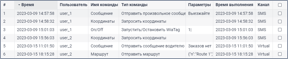 Канал | Тип связи, который использовался для отправки команды на объект: TCP, UDP, Virtual или SMS. См. подробнее. |