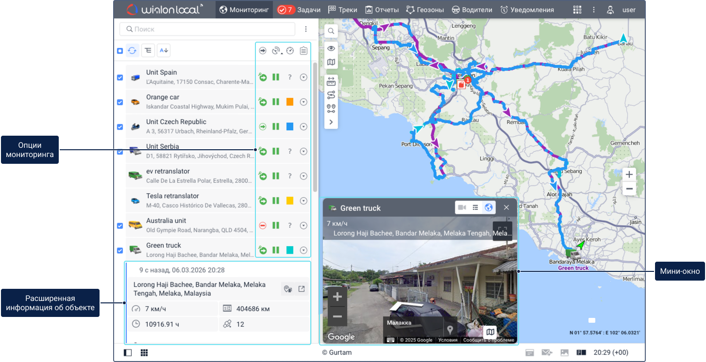 На вкладке Мониторинг показывается рабочий список объектов и карта, на которой можно наблюдать за их передвижением в реальном времени. Здесь доступны основные функции, связанные со слежением за объектами и контролем их параметров.
