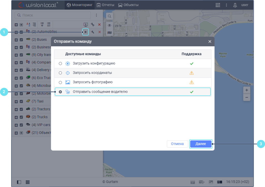 Выберите необходимую команду из списка. Показываются только те команды, которые можно отправить в данный момент в зависимости от доступных типов связи. При отправке на группу объектов напротив команд показываются следующие знаки: