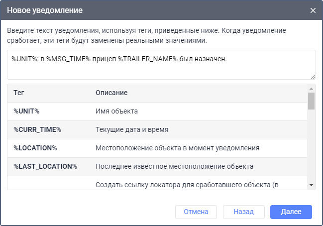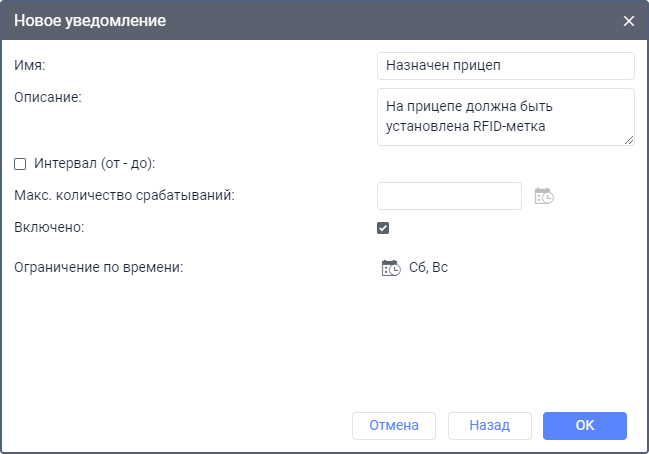 Установите параметры, которые зависят от типа выбранного уведомления и подробно описаны на странице Типы уведомлений.