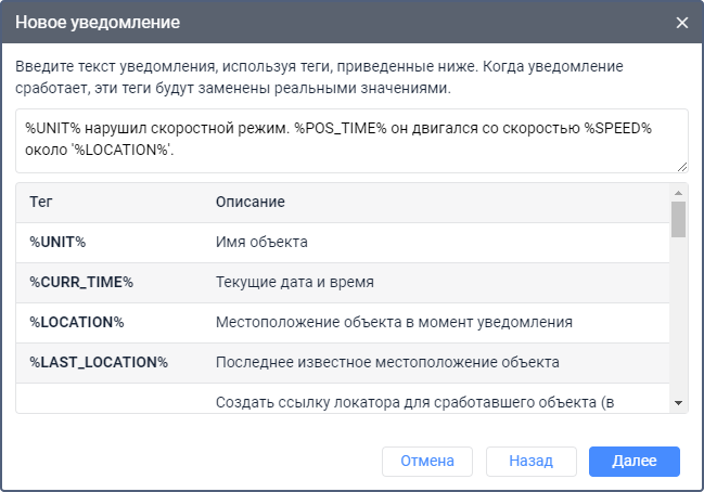 В текст можно добавить теги — ключевые слова, которые при формировании текста уведомления преобразуются в значения, которым они соответствуют. Например, текст «Объект %UNIT% нарушил ограничения по скорости и в %POS_TIME% двигался со скоростью %SPEED% около ‘%LOCATION%’» преобразуется в «Объект Ровер119 нарушил ограничения по скорости и в 2022-05-01 12:01:37 двигался со скоростью 156 км/ч около ‘Ленинградское шоссе’». Для добавления тега в текст щелкните по нему или введите вручную.