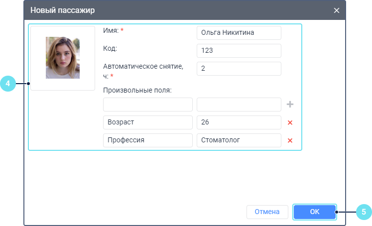 Укажите свойства пассажира: имя, код автоматического назначения и снятия, а также время, через которое пассажир должен сниматься с объекта автоматически (от 0 до 99 часов, по умолчанию — 10). Если в поле указано 0, автоматическое снятие отключено. См. Алгоритм назначения и снятия. При необходимости добавьте произвольные поля и загрузите фотографию в формате PNG, JPG, GIF или SVG. Все свойства пассажира, кроме времени автоматического снятия, аналогичны одноименным свойствам водителя.