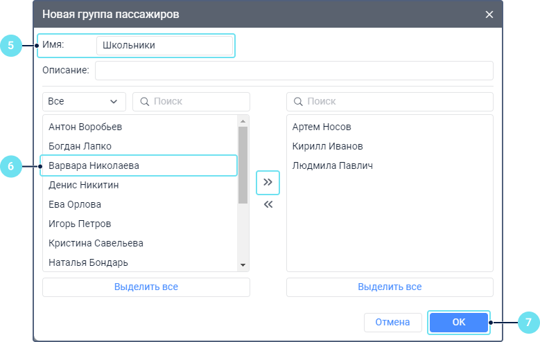 - Выберите пассажиров, которые должны входить в группу. Для этого в списке слева выделите необходимых и перенесите их в список справа с помощью иконки