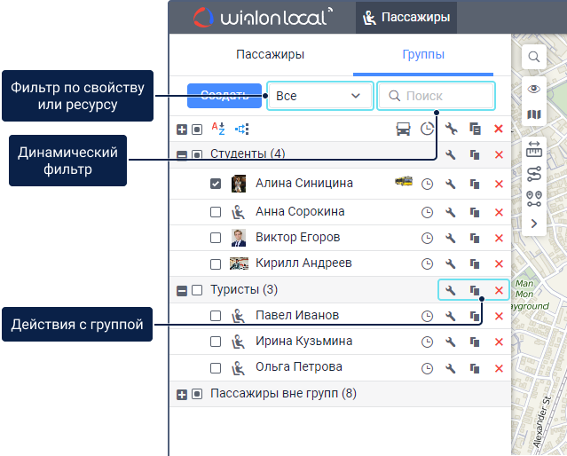 Разверните строку группы, чтобы увидеть входящих в нее пассажиров и выполнить действия с ними. Чтобы на карте показывались все пассажиры из группы, отметьте ее в списке.