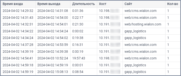 | Сайт | Название сервиса, на который заходил пользователь. Если вход был выполнен через веб-интерфейс, к названию сервиса добавляется префикс web/. |