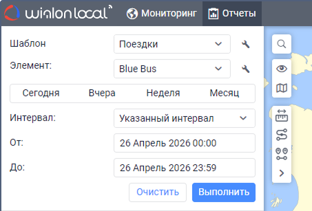 Выбор быстрого интервала осуществляется нажатием на кнопки Сегодня, Вчера, Месяц, Неделя. Отчет в таком случае генерируется сразу, на кнопку Выполнить нажимать не нужно.