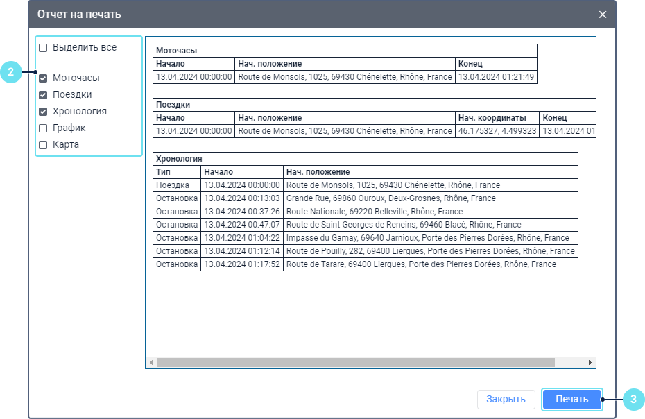 В левой части окна выберите те таблицы, графики или другие разделы отчета, которые вы хотите вывести на печать. Чтобы выбрать все разделы, нажмите на Выделить все. В правой части показывается содержимое отчета.