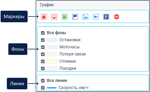 В этом блоке показываются маркеры, выбранные в настройках графика. Во всплывающей подсказке к маркеру показывается, какой тип событий он обозначает. Если для объекта настроено несколько датчиков уровня топлива, то каждому из них соответствуют маркеры слива и заправки с числовым индикатором.